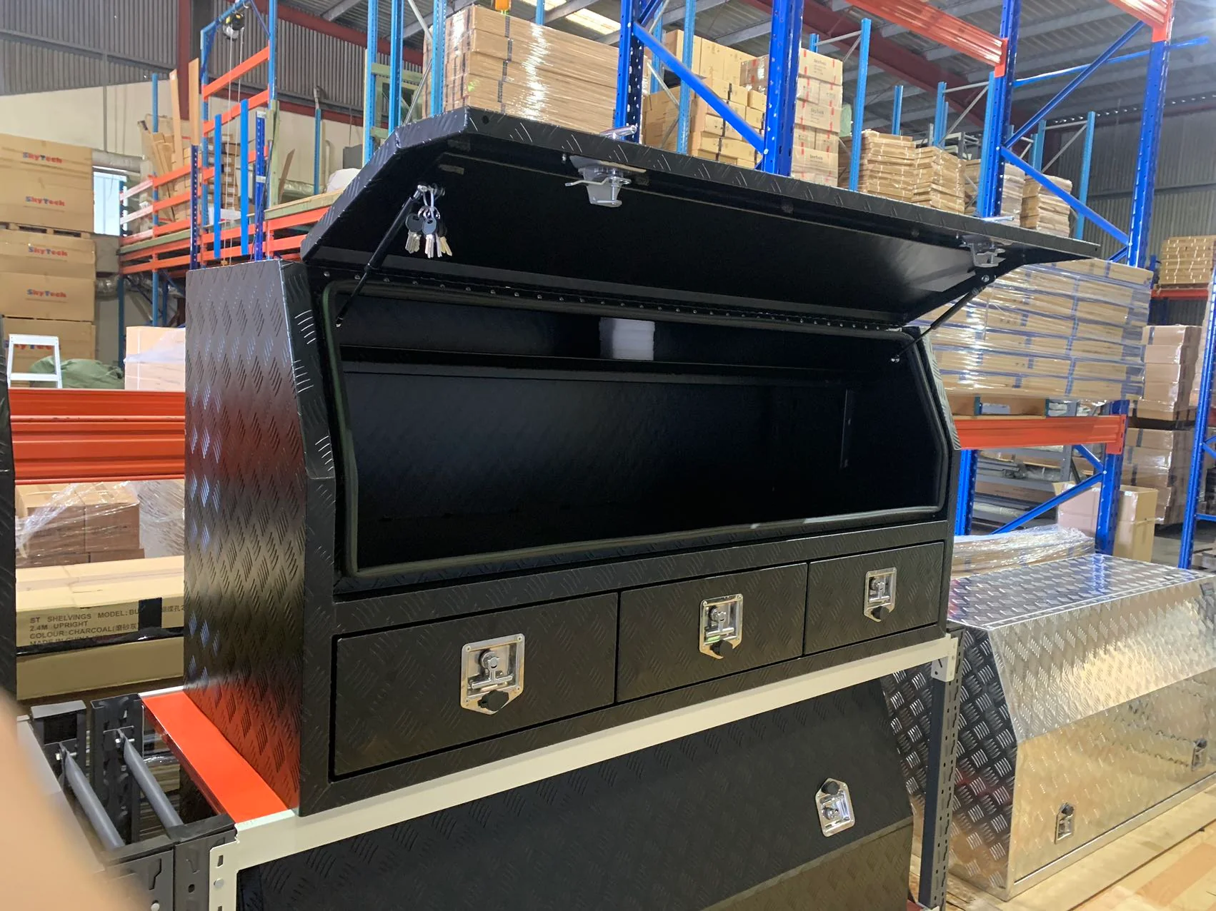 (Half Open) 170cm(L) x 60cm(D) x 80cm(H) Aluminum Checkerplate Tool Box for UTE & Trailer Storage (3 Drawers + Adjustable Shelf) (Black)